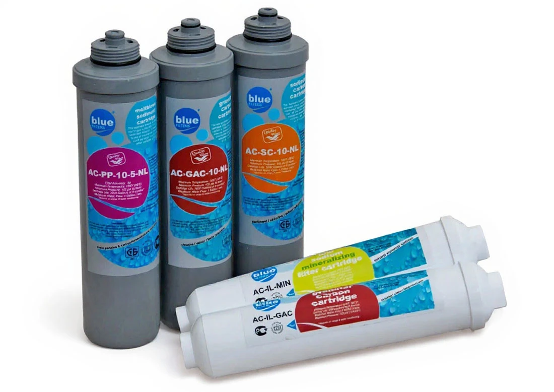 Zestaw profesjonalnych wkładów wymiennych do filtrów wody Bluefilters NewLine RO6. W komplecie znajduje się pięć wkładów filtrujących: trzy wstępne serii NewLine i dwa końcowe InLine.