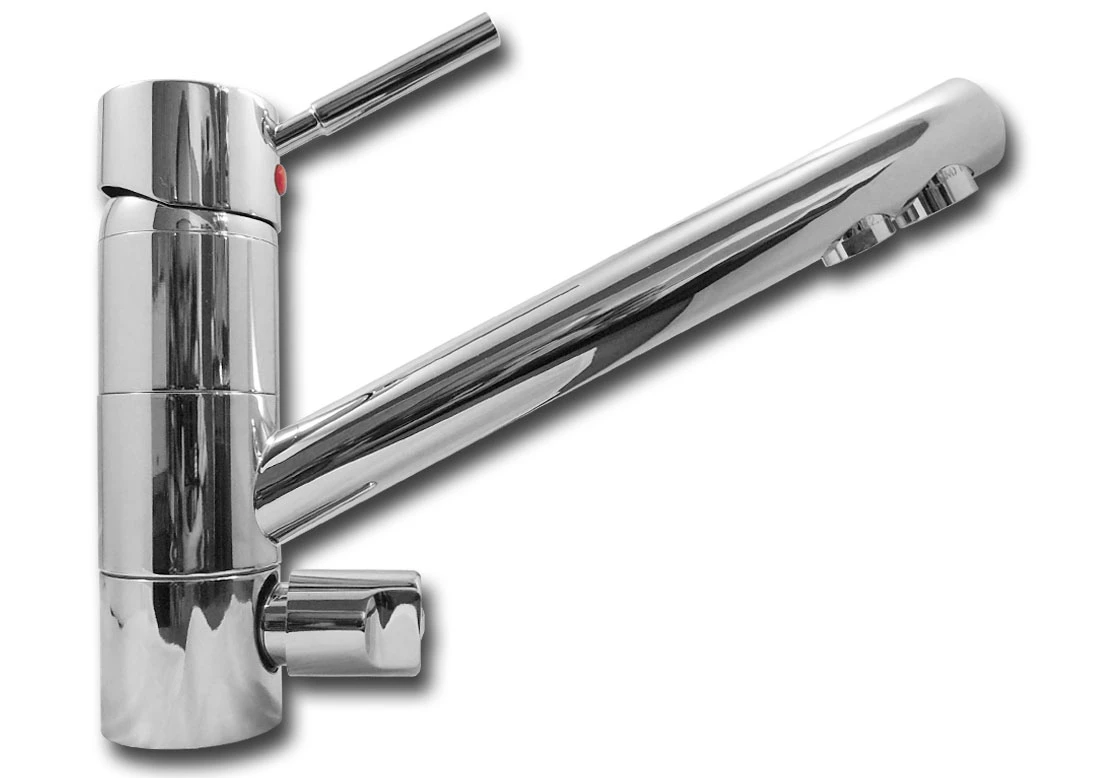 Bateria ma dwa osobne "kurki" - pierwszy, znajdujący się na górze, to klasyczna głowica z funkcją mieszacza bieżącej wody zimnej i ciepłej. Wychylając ramię w górę reguluje się intensywność przepływu wody a przesuwając ramię w prawo i lewo, ustala się temperaturę wody (od całkiem zimnej, poprzez mieszaną aż po całkiem gorącą). Drugi, znajdujący się poniżej wylewki, to obrotowa głowiczka, po przekręceniu której z osobnego perlatora wypływa woda z systemu uzdatniania wody.