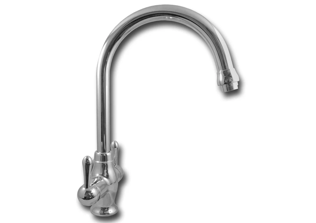 Trójdrożna bateria zlewozmywakowa, umożliwiająca podłączenie trzech źródeł wody i pobieranie jej z jednego punktu. Solidna konstrukcja wykonana ze stopów metali nieżelaznych, odporna na korozję i powleczona galwanicznie chromem.