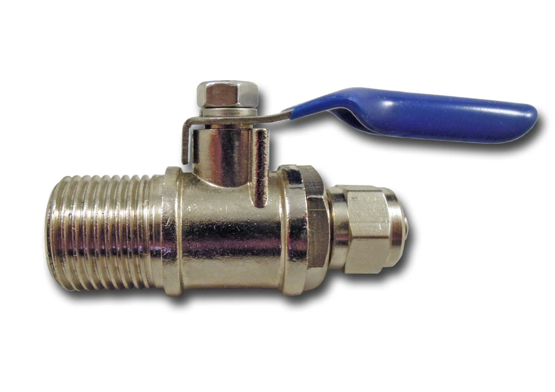 Metalowy zawór kulowy stosowany typowo do podłączenie dopływu wody do filtra. Umożliwia bezpośrednie podłączenie wężyka 1/4 cala stosowanego z domowymi filtrami wody z instalacją wodną 3/8 cala (np. z wężykami w oplocie metalowym, używanymi do podłączenia baterii zlewozmywakowej).