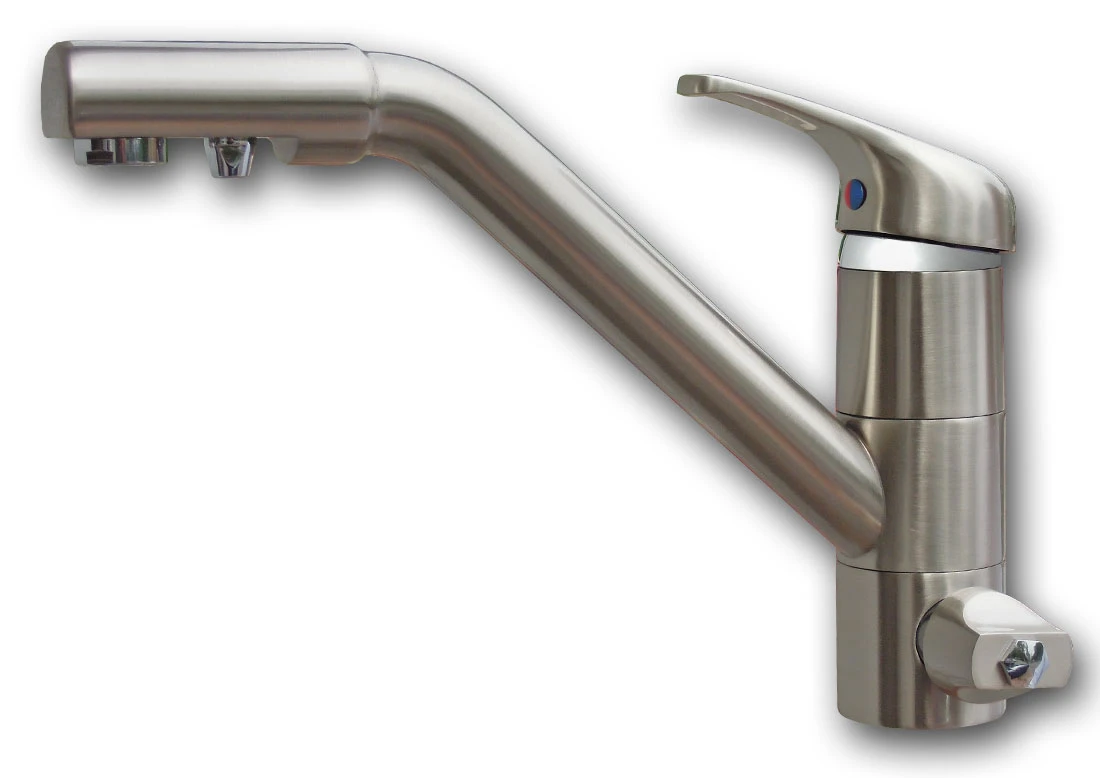 Bateria zlewozmywakowa umożliwiająca używanie w jednym kranie wody gorącej, zimnej i filtrowanej. Solidnie wykonana bateria zlewozmywakowa, wyposażona w wężyki i przyłącza wody 3/8".