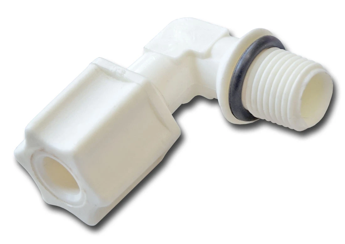 Kolanko 1/8" gwint zewnętrzny x 1/4" pod przewód. Stosowana w podzlewozmywakowych systemach uzdatniania wody, w tym w systemach typu odwrócona osmoza.