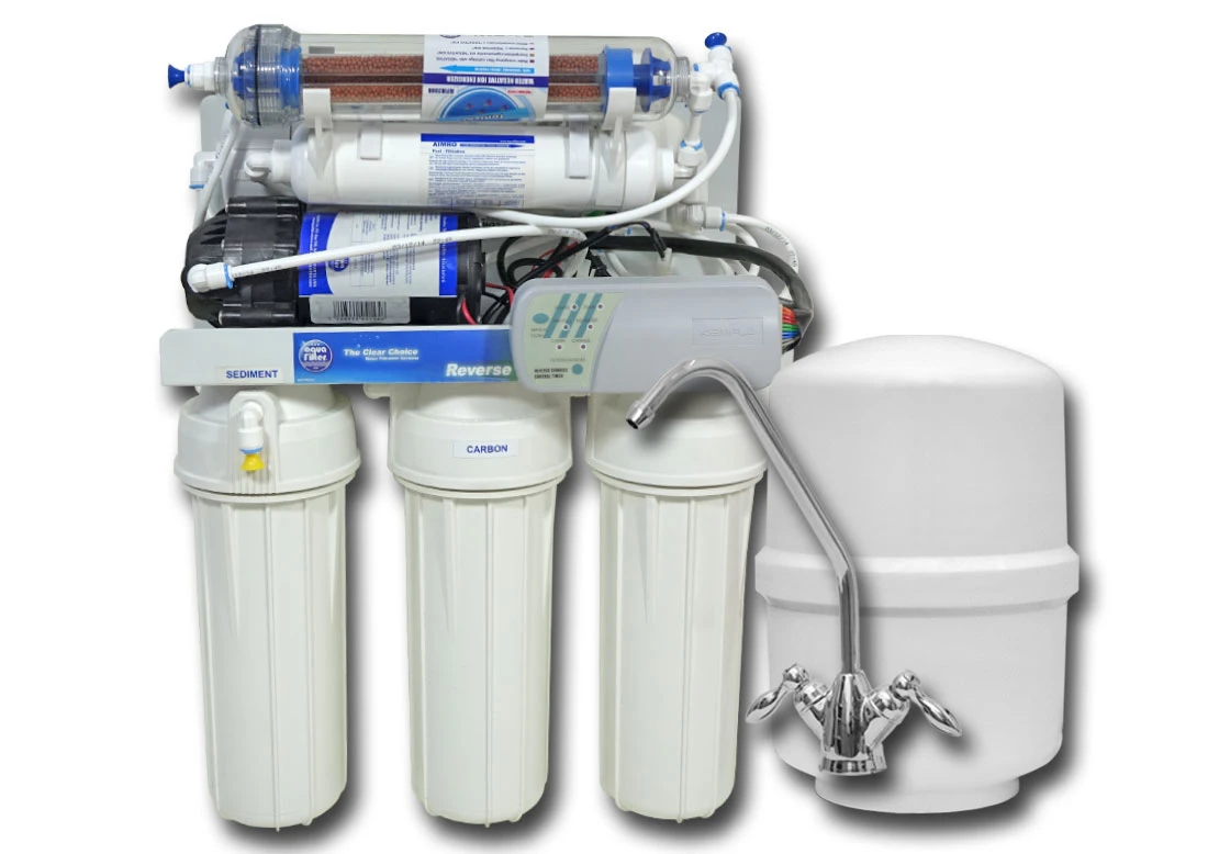 Profesjonalny filtr uzdatniający wodę metodą odwróconej osmozy z mineralizacją wody i końcowym modułem jonizacji wody - komplet ze zbiornikiem, kranikiem i wkładami. Filtr 7-mio stopniowy, jednego z najlepszych producentów na świecie. Firma Aquafilter jest pionierem w wielu technologiach związanych z uzdatnianiem wody.