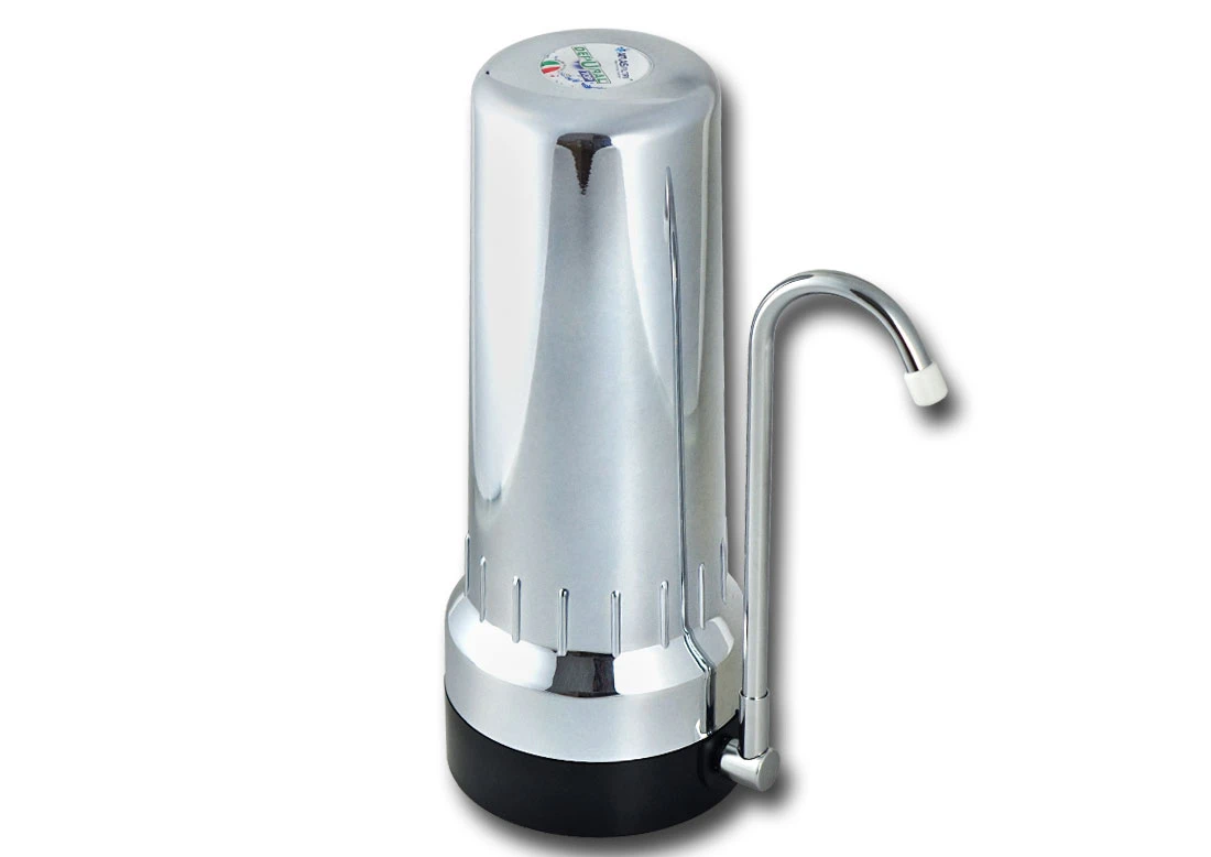 Chromowany wolnostojący filtr kuchenny AtlasFiltri Depural Top SX, stosowany do filtracji lub uzdatniania wody. Bardzo łatwy w podłączeniu do końcówki wylewki baterii kuchennej w miejsce odkręconego perlatora. W komplecie znajduje się podłączenie instalowane zamiast perlatora (aeratora) z zaworem przełączającym oraz perlatorem.