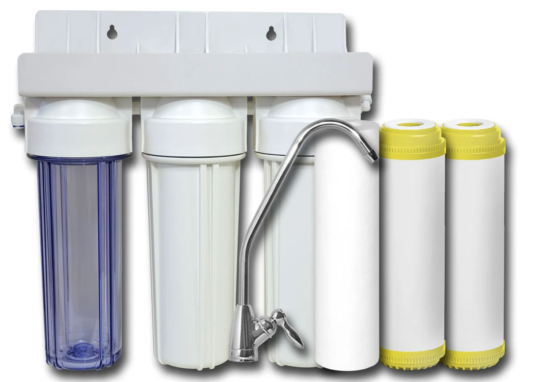 Kuchenny filtr wody montowany typowo w szafce pod zlewozmywakiem. Dołączony do filtra komplet trzech wkładów, dedykowany jest do zmiękczania twardej wody oraz usuwania zanieczyszczeń mechanicznych.