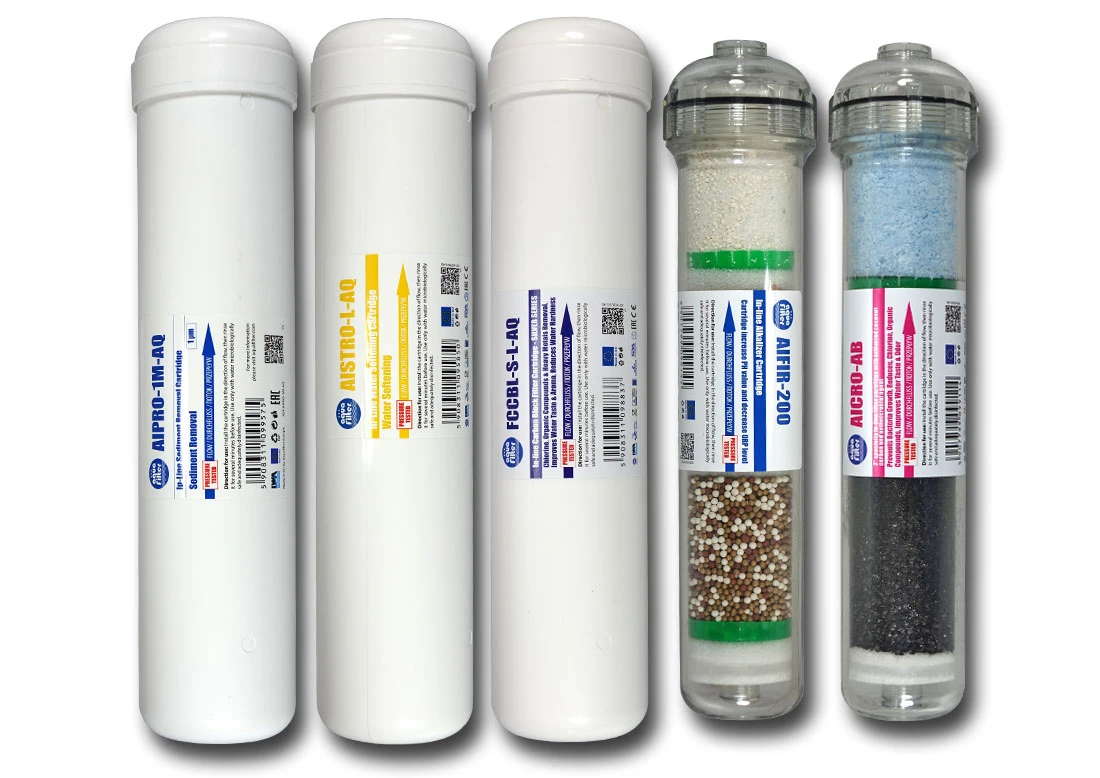 Pełen zestaw wkładów do profesjonalnego filtra wody z jonizatorem, Aquafilter EXCITO-CL. Wersja alternatywna z wkładami nieprzezroczystymi. Na zestaw składają się:
