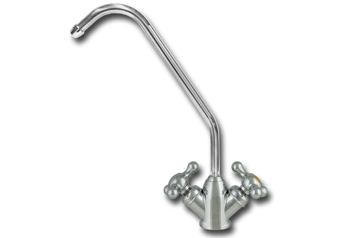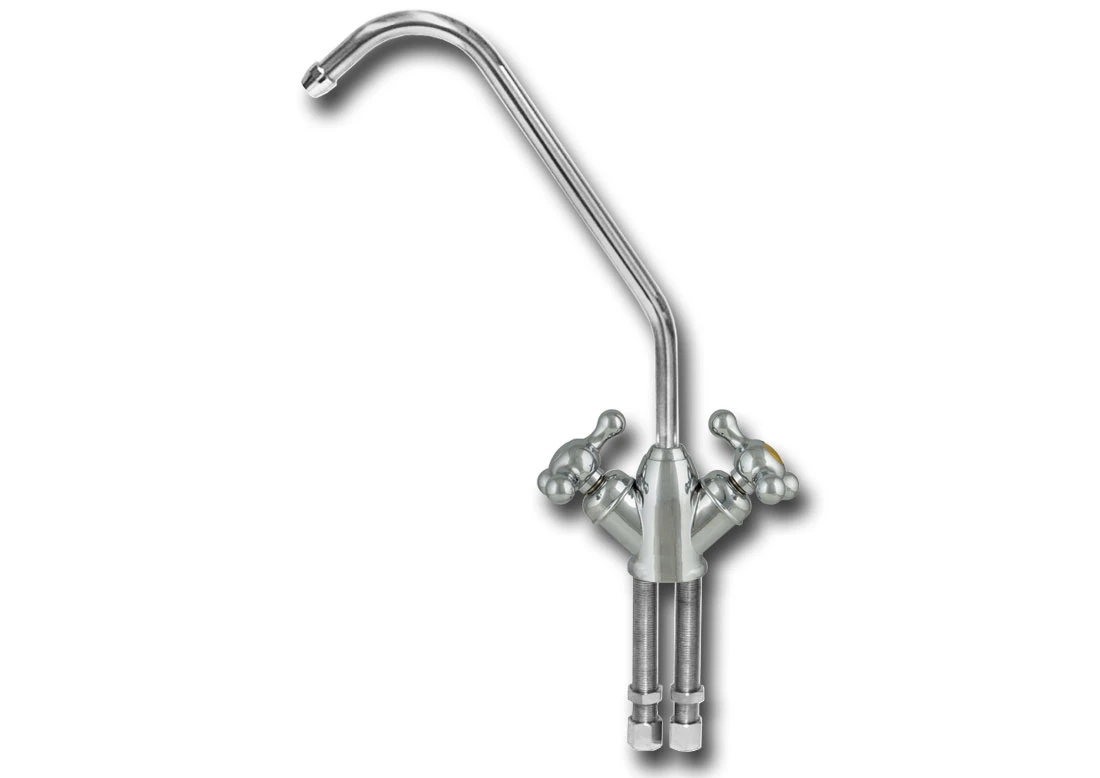 Podwójny kranik chromowany z zaworami ceramicznymi. Stosowana z systemami odwróconej osmozy z mineralizatorem. Stylistycznie utrzymany w stylu retro.