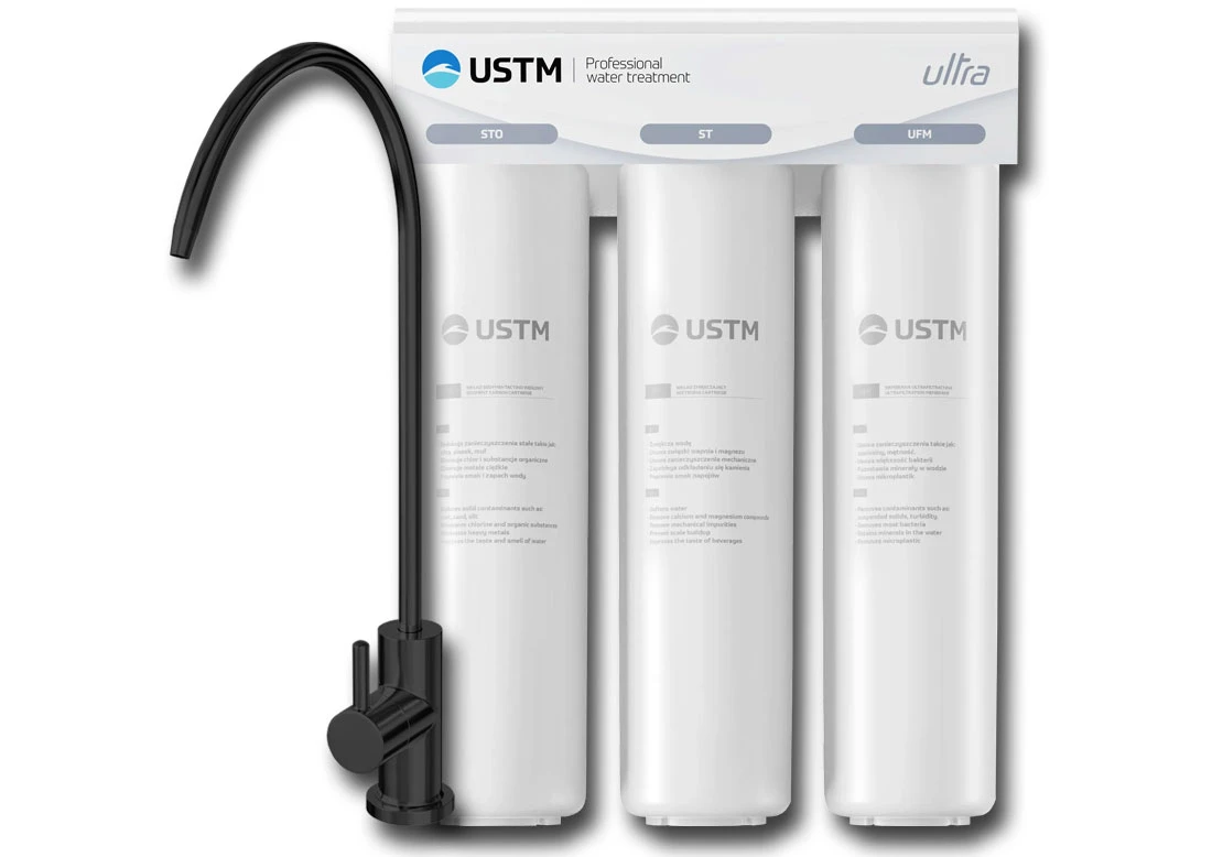 Kuchenny filtr wody montowany typowo w szafce pod zlewozmywakiem. Filtr zawiera komplet wkładów dedykowany do zmiękczania twardej wody, usuwania zanieczyszczeń mechanicznych i chloru oraz eliminacji z wody bakterii.