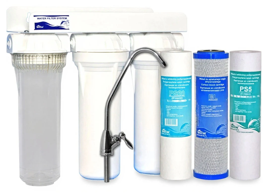 Filtr do uzdatniania wody oparty o trzy stopnie filtracji, które umożliwiają dobranie wielu różnych zestawów wkładów. W filtrze można stosować dowolne, standardowe wkłady o wysokości 10 cali (również wkłady o wysokości 9 7/8 cala) i przeciętnej średnicy 2 1/2 cala. Z uwagi na średnice wężyków przyłączeniowych oraz dedykowany, chromowany kranik do pobierania wody uzdatnionej, który znajduje się w komplecie, filtr montowany zwykle w szafce pod zlewozmywakiem, gdzie mieści się swobodnie (nawet w wąskich szafkach 40-stkach). Przykładowe konfiguracje (zestawy) wkładów z jakimi oferujemy ten filtr do wody opisane są niżej - standardowo produkt dostarczamy w podstawowej wersji (standard). W przypadku gdy interesuje Państwo wersja z inną konfiguracją wkładów, prosimy o kontakt telefoniczny.