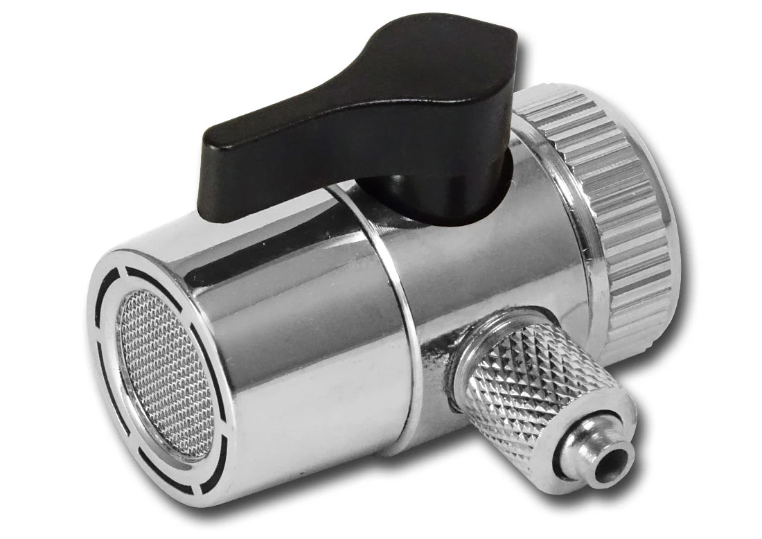 Przyłącze wody pod wylewkę baterii zlewozmywakowej. Solidne, metalowe, chromowane przyłącze z kulowym zaworkiem i podłączeniem na wężyk, którym doprowadza się wodę do filtra.