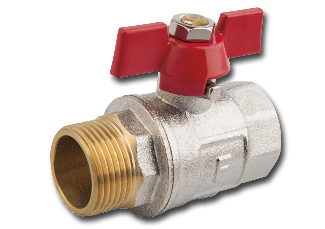 Metalowy zawór kulowy - niklowany. Typowe zastosowanie to montaż na instalacji wodnej w celu umożliwienia odcięcia dopływu wody.
