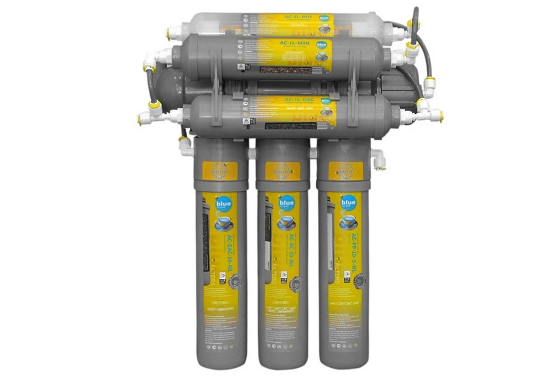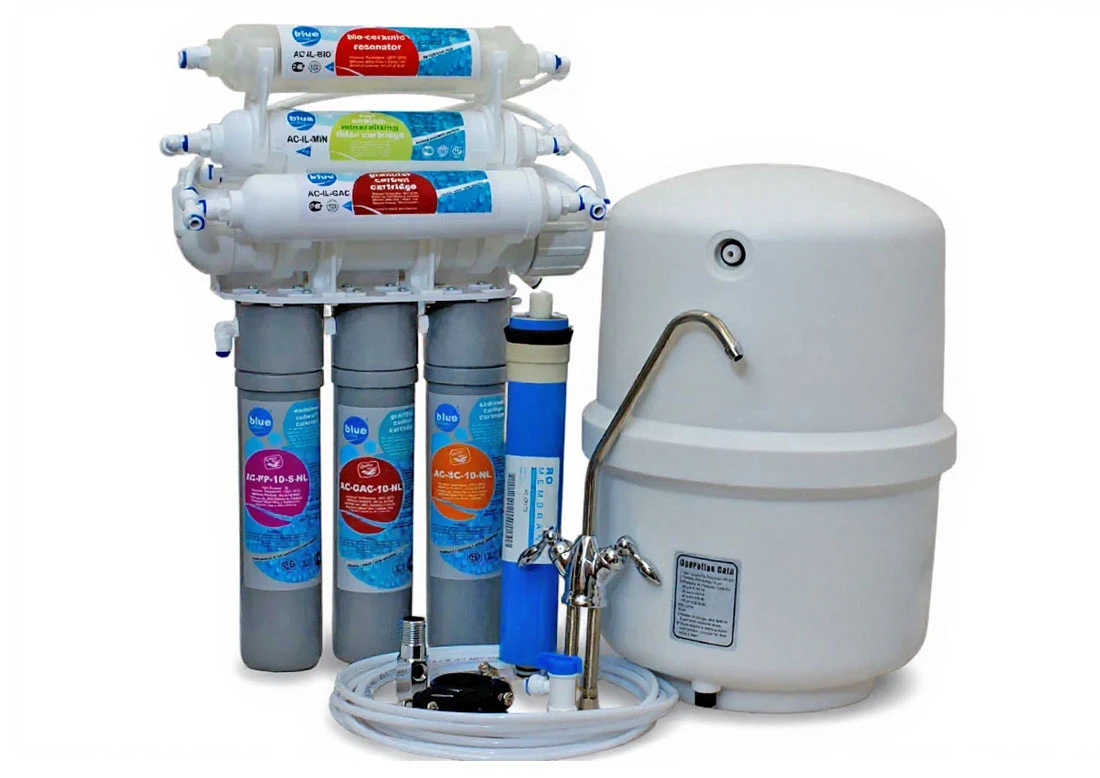 Do Klienta dostarczamy kompletny system Bluefilters New Line RO7 wraz ze zbiornikiem do gromadzenia idealnie czystej wody (15 litrów brutto / 10 litrów netto) i kranikiem z dwoma kurkami (jeden dla wody mineralizowanej, drugi dla wody bez mineralizacji).