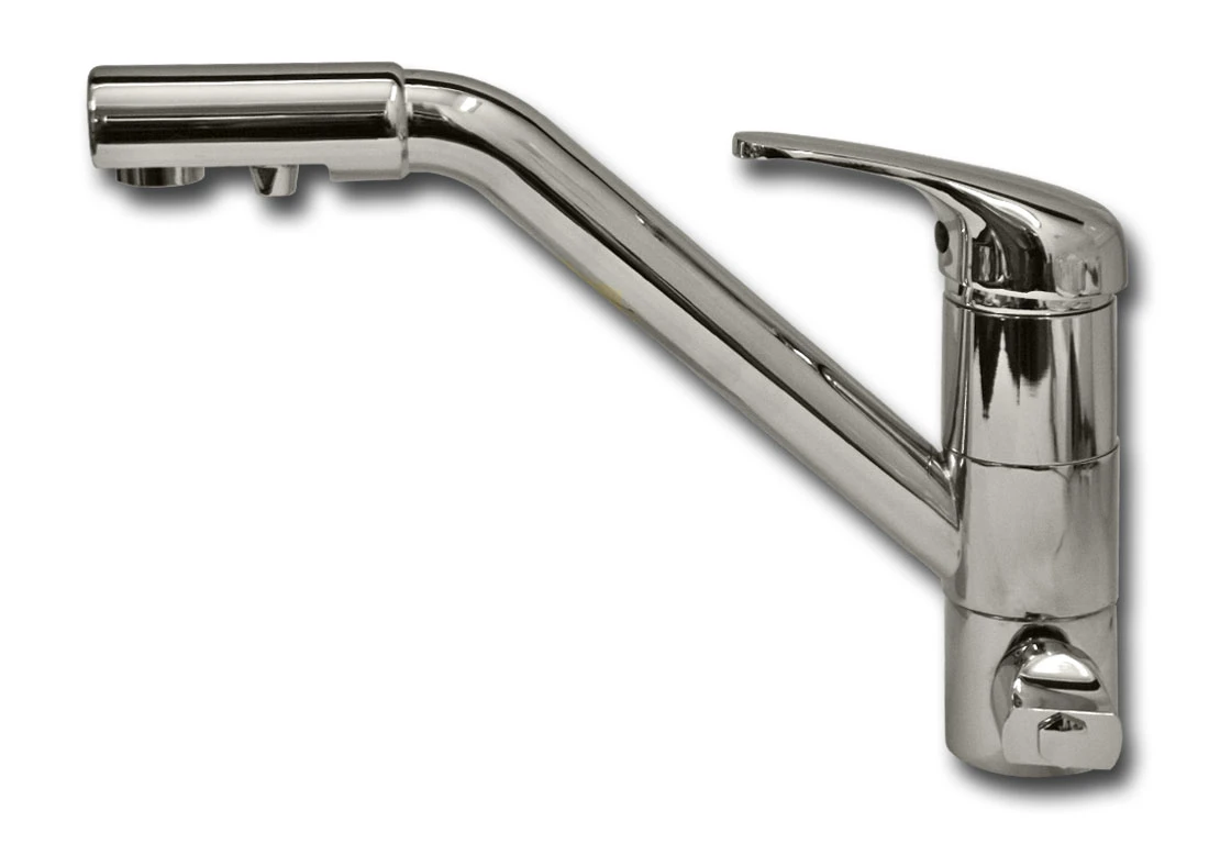 - baterią zlewozmywakową z podłączeniem do wody zimnej, ciepłej i z filtra (tutaj znajdziesz więcej informacji o baterii: kliknij). Przez tą baterię można pobierać idealnie czystą, mineralizowaną wodę do celów spożywczych oraz jak z każdej innej baterii, wodę użytkową zimną i ciepłą