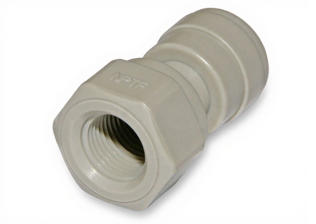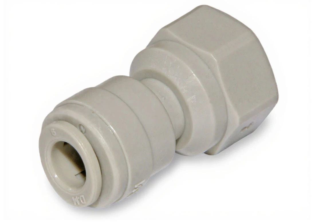 Aquafilter A4FA18 z jednego końca posiada otwór z gwintem wewnętrznym 1/8 cala a z drugiej strony otwór na wężyk 1/4 cala (około 6,5 mm).