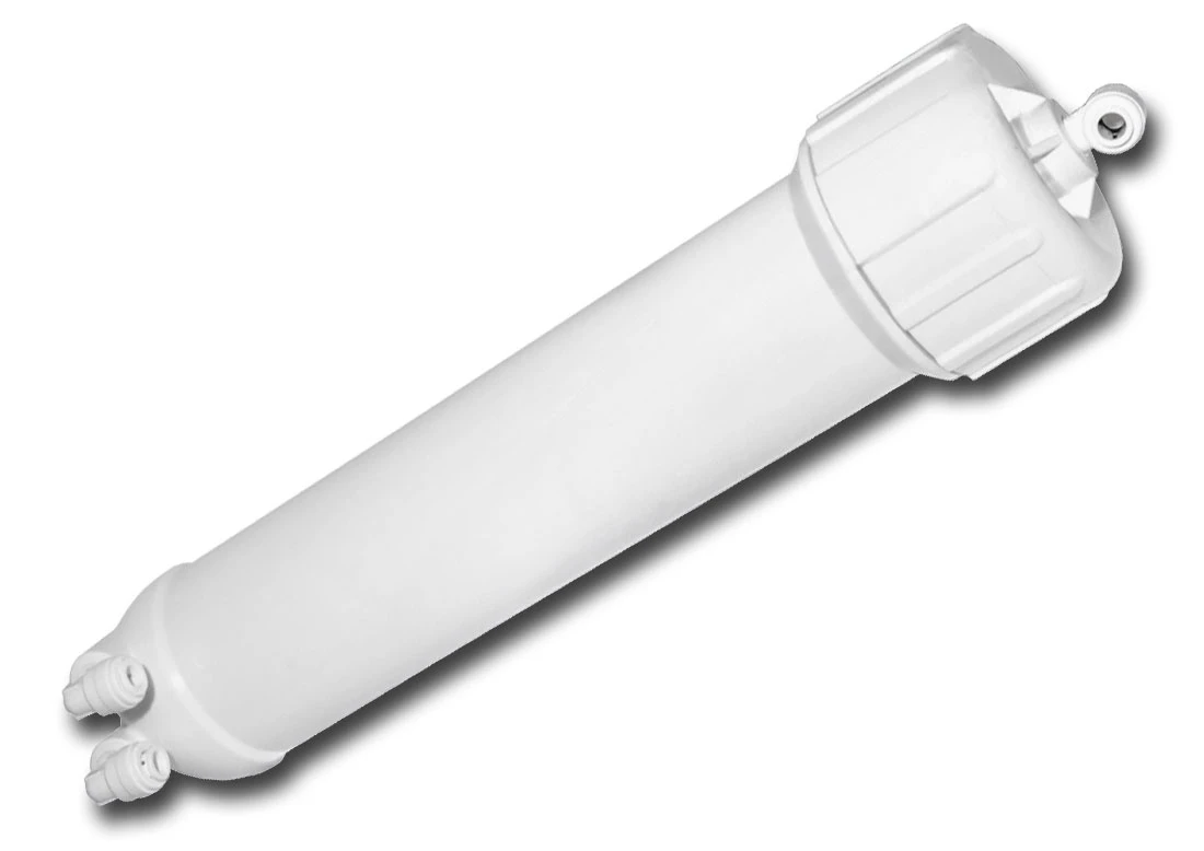 Kompletna obudowa do membrany osmotycznej z zamontowanymi złączkami - w komplecie znajdują się wkręcone i uszczelnione kolanka, w tym kolanko z zaworem zwrotnym (jednokierunkowym) na wyjściu wody czystej. W obudowie można zamontować każdą z typowych membran o dowolnej wydajności, dowolnego z producentów (typowo od 50 do 150 GPD).