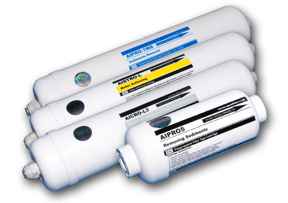 Zestaw czterech oryginalnych wkładów Aquafilter, dzięki którym użytkownik nie traci gwarancji na urządzenie. Używając wkładów Aquafilter, zachowany zostaje wysoki standard uzdatniania wody.