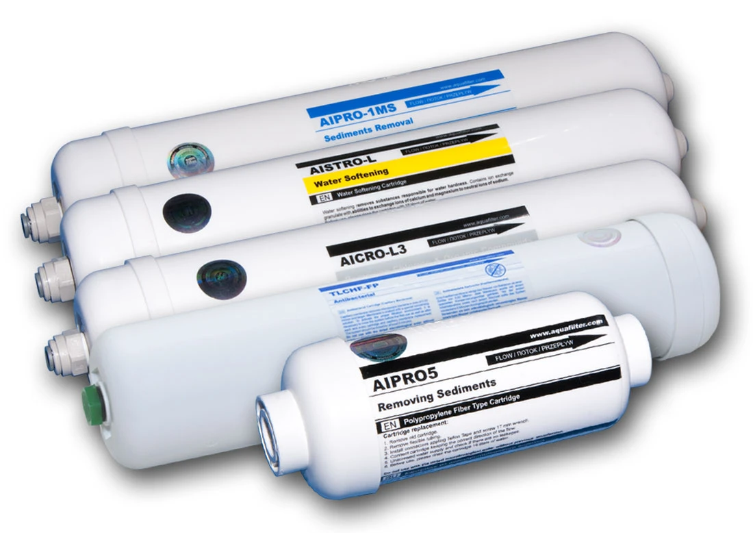 Zestaw oryginalnych wkładów Aquafilter, dzięki którym użytkownik nie traci gwarancji na urządzenie. Używając wkładów Aquafilter, zachowany zostaje wysoki standard uzdatniania wody.