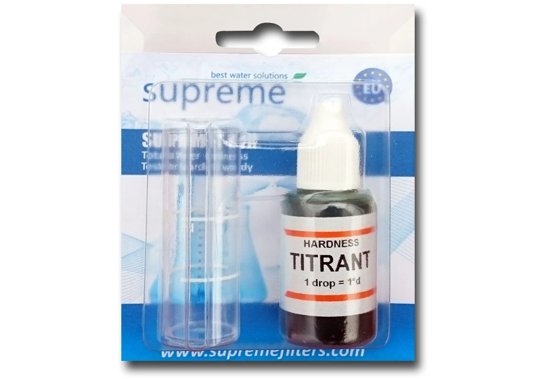 Profesjonalny kropelkowy tester twardości ogólnej wody TITRANT. Pomocny w określeniu twardości wody w użytkowanej instalacji wodnej. Tester pozwala na wielokrotne wykonanie pomiaru (w zależności od twardości wody, może to być 10 pomiarów jak i 30 pomiarów - typowo, 20 pomiarów przy 15 dH). Tester określa twardość wody w jednostkach dH (stopnie niemieckie), które są powszechnie używane w Polsce.